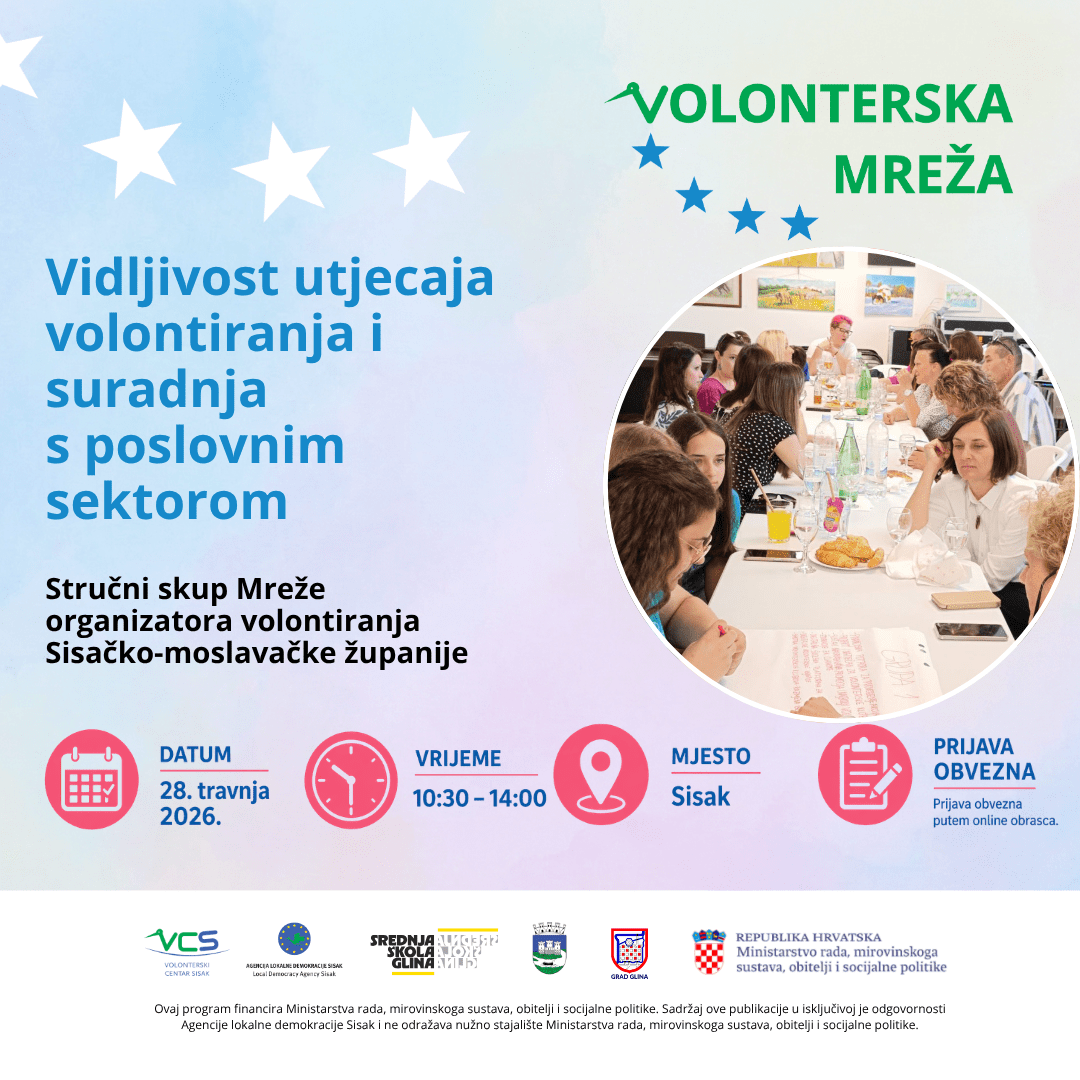 Agencija lokalne demokracije Sisak zajedno s partnerima poziva vas na stručni skup Mreže organizatora volontiranja Sisačko-moslavačke županije, koji se organizira u okviru programa Volonterska mreža.